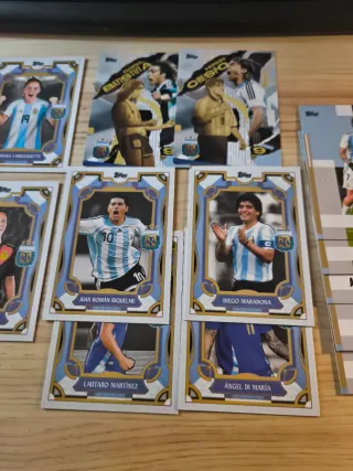 Lote de cromos Topps Team Set de Argentina 2024. - Incluye jugadores como Julián Álvarez, Enzo Fernández, Alexis Mac Allister, Rodrigo De Paul, Lautaro Martínez, Ángel Di María, entre otros. - Cromos de la selección argentina. - Edición 2024.