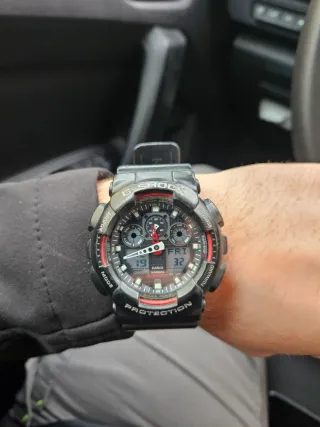 Reloj Casio G-Shock con diseño robusto y deportivo. - Correa de resina negra. - Esfera con detalles en rojo. - Resistente a golpes y agua.