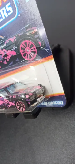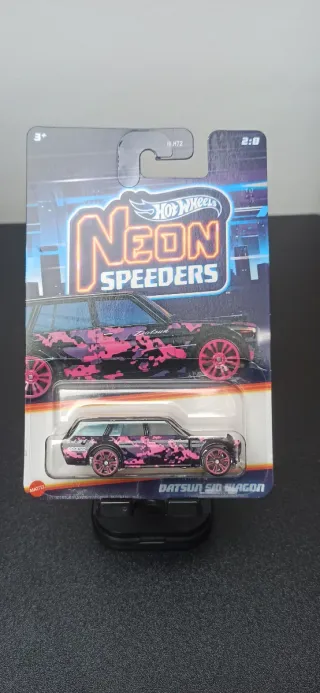 Coche de juguete Hot Wheels Datsun 510 Wagon de la serie Neon Speeders. - Diseño con camuflaje rosa y negro. - Ruedas rosas. - Empaquetado original.