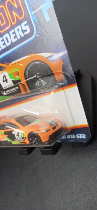 Coche de juguete Hot Wheels de la serie Neon Speeders. - Modelo: BMW M3 GT2. - Color: Naranja con detalles verdes y blancos. - Número: 4. - Serie: Neon Speeders. - Marca: Hot Wheels.