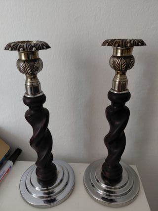Elegante par de candelabros vintage con un diseño único. - Base y parte superior de metal plateado. - Cuerpo central de madera oscura con forma retorcida. - Detalle de hojas grabadas en la parte superior metálica.