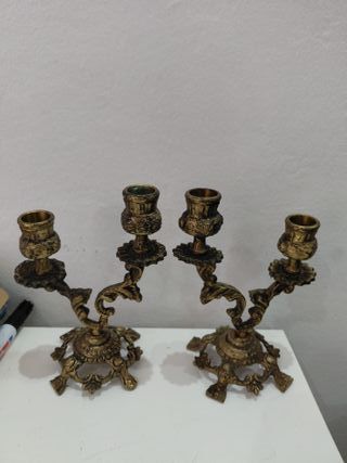 Par de candelabros vintage madera y metal