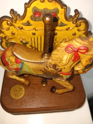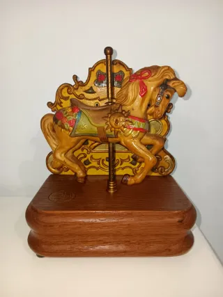 Encantadora caja de música con un carrusel giratorio. - Diseño detallado de caballo de carrusel. - Base de madera con acabado rústico. - Elementos decorativos dorados y coloridos.