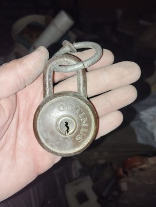 Candado vintage de bronce con la marca OPTIMUS grabada. - Material: Bronce - Diseño circular Sin llave