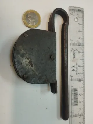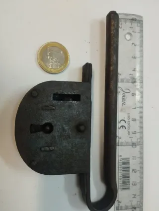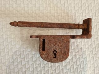 Candado antiguo con un diseño robusto Fabricado en hierro forjado, presenta una pátina de óxido que evidencia su antigüedad. Tienes las medidas en la foro. - Mecanismo de cierre visible. - Barra de arrastre con remates decorativos. - Soporte de montaje en forma de L.