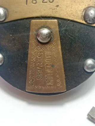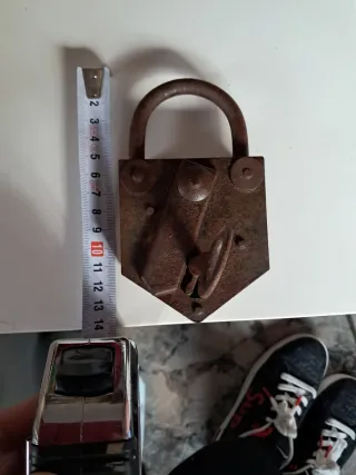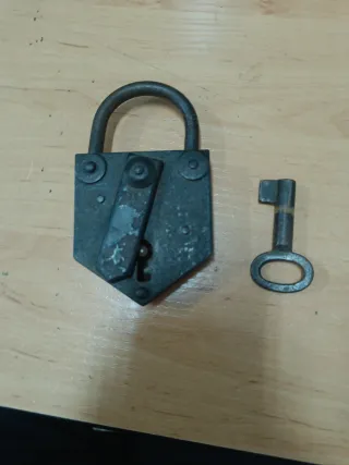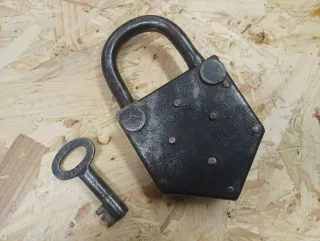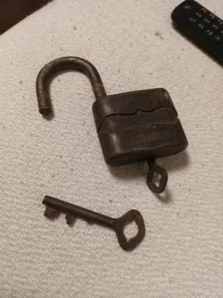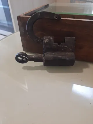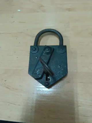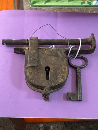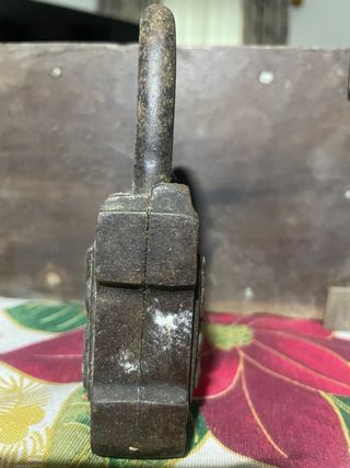 Este es un candado antiguo, fabricado en hierro, con un diseño robusto y característico. Material: Hierro. Tiene llave que funciona