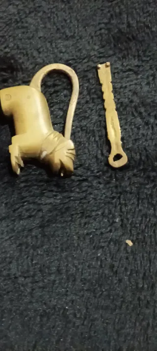 Este es un candado antiguo, ideal para coleccionistas. Su diseño es único y no se ve comúnmente. - Material: Metal dorado. - Diseño: Forma de animal (posiblemente un león o caballo). - Incluye llave a juego.