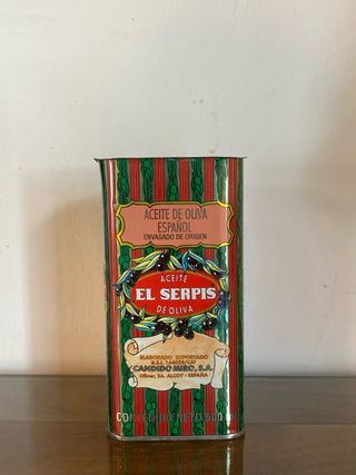 Antigua lata de aceite de oliva español de la marca El Serpis. - Contenido neto: 500 ml. - Elaborado y exportado por Cándido Miró, S.A.