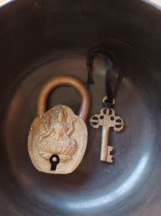Este es un candado antiguo de estilo hindú, con un diseño intrincado y una figura central. - Fabricado en metal con acabado en bronce. - Incluye una llave decorativa a juego,para abrir y cerrar. Funciona perfectamente.