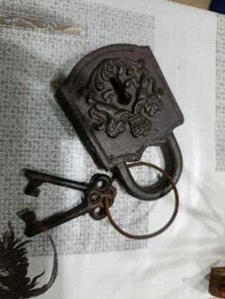 Este es un candado antiguo fabricado en metal, con un diseño robusto y clásico. Incluye dos llaves. - Material: Metal - Incluye: 2 llaves - Estilo: Antiguo