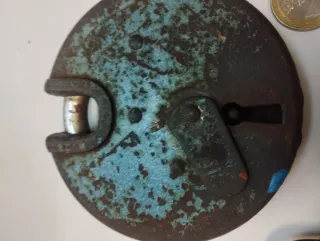 Candado antiguo, con robusto. Incluye su llave original. Funciona correctamente. - Material: Metal oxidado. - Forma: Circular con orejas. - Incluye: Llave.