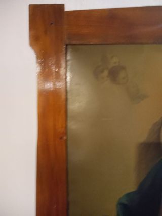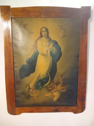 Antigua lámina de la Virgen en un bonito marco artesanal pintado a mano.
