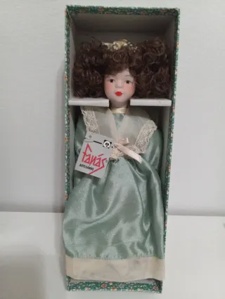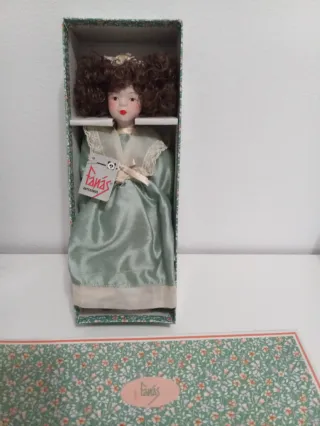 Preciosa muñeca de porcelana de la marca Fanas Artesanía, presentada en su caja original. - Muñeca de porcelana. - Vestido de satén verde menta. - Detalle de encaje en el cuello. - Incluye etiqueta de la marca.