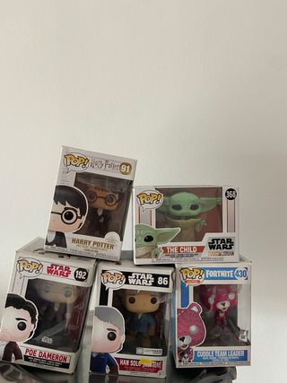 Lote de 5 figuras Funko Pop de coleccion. - Funko Pop Harry Potter #91 - Funko Pop Star Wars The Child #368 - Funko Pop Star Wars Poe Dameron Loot crate EXCLUSIVE #192 - Funko Pop Star Wars Han Solo Snow Gear #86 - Funko Pop Fortnite Cuddle Team Leader #430