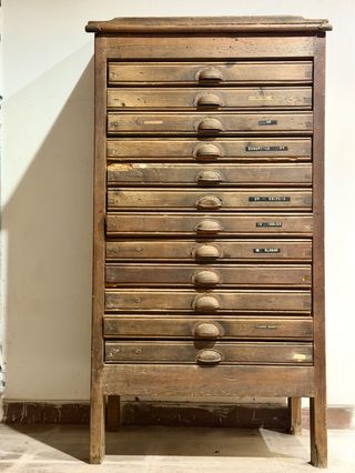 Comodí d’imprenta antic, d’uns 100 anys d’història, ideal per a col·leccionistes, amants del vintage o per donar un toc únic a qualsevol espai. Tipografia original en la majoria de calaixos. • Mobiliari sense corc, sòlid i estable. • Peça amb encant i caràcter: tot i que es podria restaurar, llueix molt bé tal com està. • A les fotos es poden veure alguns desperfectes propis del pas del temps.