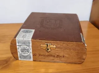 Caja antigua de madera de la Compañía de Tabacos. - Diseño clásico. - Grabado de escudo en la tapa. - Cierre metálico frontal. - Inscripción 25 Tabantillas No.3 en la parte frontal.
