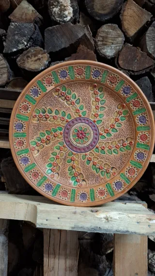 Plato decorativo de cerámica del convento aracena Medidas 39 cm. Plato ceramica del convento J.M. Medidas 29 cm , tiene un pequeño defecto Precio por los dos - Diseño con motivos florales y geométricos. - Colores vivos y detallados. - Acabado rústico y texturizado. - Inscripción Ceramica del Convento, J.M.