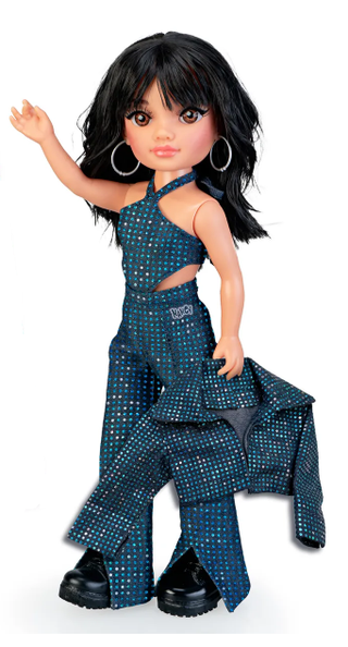 Muñeca Nancy Aitana con pelo largo y oscuro. - Pelo negro y largo. - Ojos marrones. - Pendientes de aro plateados. - Vestido con estampado brillante.