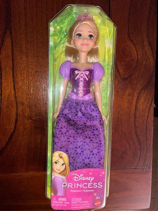 Muñeca de la Princesa Rapunzel de Disney. - Vestido morado con detalles brillantes. - Corona rosa. - Cabello rubio largo.