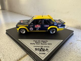 Réplica a escala 1:43 del Fiat 131 Abarth que compitió en el Rally San Remo de 1977. - Modelo: Fiat 131 Abarth - Edición limitada a 250 piezas - Pilotos: Röhrl / Pitz - Año: 1977 - Escala: 1:43 - Marca: SCALA La urna de plastico tiene una grieta en la parte de arriba, sacando eso, la maqueta esta en perfectas condiciones.
