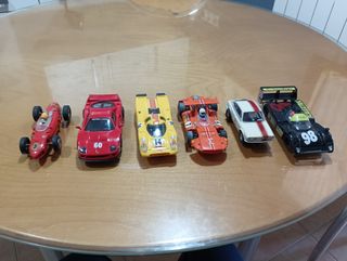 Conjunto de seis coches de slot Scalextric. - Coche de carreras rojo con dorsal 3. - Ferrari rojo con dorsal 60. - Coche amarillo con dorsal 14. - Coche de carreras naranja con dorsal 1. - Coche blanco y rojo. - Coche negro con dorsal 98. En buen estado que haya podido observar solo falta un escape al Ferrari y un aletin con desperfectos al Porsche 917