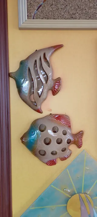 Conjunto de decoraciones de cerámica con temática marina. Precio por pieza a negociar y por packs a negociar. - Figuras de peces y cangrejos. - Diseños variados en color y forma. - Material: Cerámica.