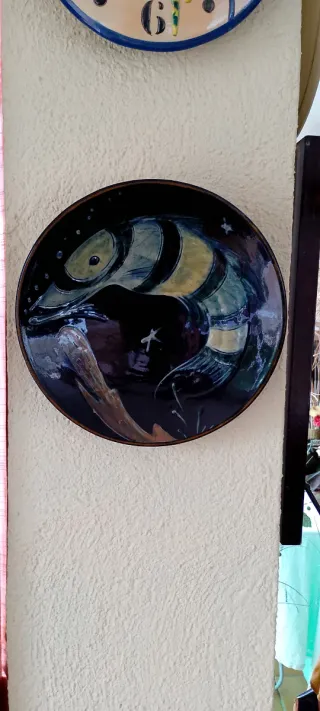 Plato decorativo de cerámica con un diseño único. Precio por pieza a negociar y por packs a negociar - Motivo de pez estilizado. - Tonos azules, negros y amarillos. - Acabado brillante.