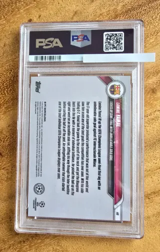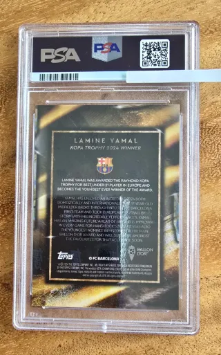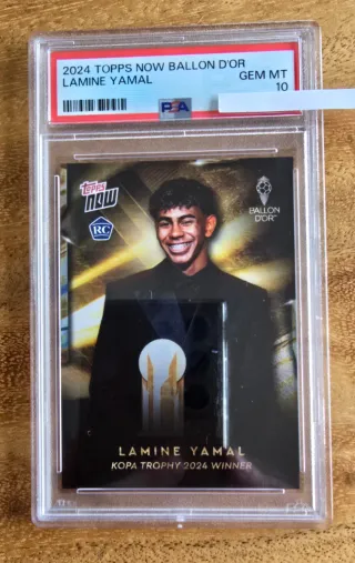 Tarjeta de colección de Lamine Yamal, ganadora del Kopa Trophy 2024. - Edición Topps Now. - Certificada por PSA con calificación GEM MT 10. - Incluye el logo de Ballon d'Or. - PSA 10