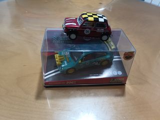 Dos coches de colección de Scalextric Club. - Coche 1: Mini Cooper rojo con dorsal 04 y techo a cuadros. - Coche 2: SEAT Cordoba WRC azul y verde con dorsal 9 y alerón amarillo, edición 2001. - Ambos coches se presentan en su embalaje original de plástico transparente.