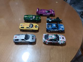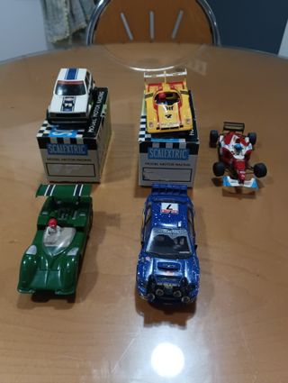 Lote de seis coches de colección Scalextric. Algún defecto alerón chaparral,falta retrovisor Lancia es lo que detectado - Coche Lancia Stratos verde y blanco. - Coche de carreras verde con dorsal 36. - Coche de carreras amarillo y azul con dorsal 3. - Coche de carreras azul. - Coche de rally rojo con dorsal 19. - Coche de rally rojo con dorsal 4.