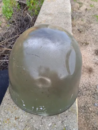 Casco militar antiguo, de color verde y con un diseño clásico. Pintura original