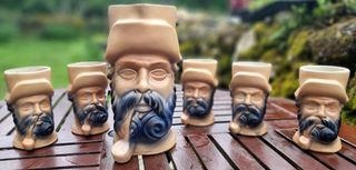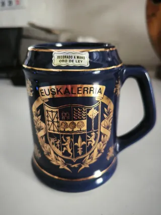 Jarra decorada a mano con baño de oro de ley. - Diseño con el escudo de Euskalerria. - Color azul marino. - Detalles dorados. - Acabado brillante.