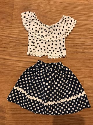conjunto ropa para Nancy años 70, confeccionada por modista en esos años, con corchetes en los cierres, genero muy bueno. Con volante en el escote muy favorecedor. Único y original.
