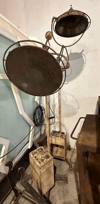 Antigua lámpara de quirófano, puede que sean militares, funcionan con bateria o enchufadas a la red, ideal para decoración vintage. Se compone de dos lámparas con estructura de metal. Tiene un diseño clásico y está en buen estado, aunque muestra señales de uso y el paso del tiempo. - Dos lámparas de estilo retro. - Estructura de metal resistente. - Ideal para decoración vintage o coleccionistas.