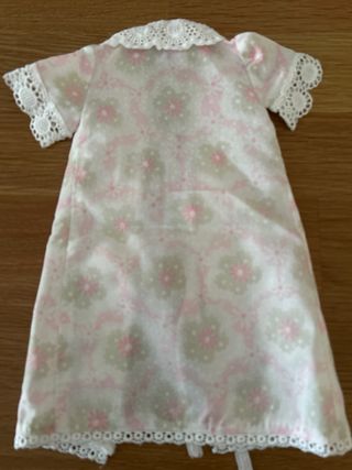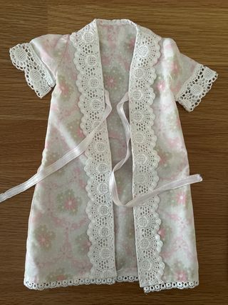 Preciosa bata, con camisón a juego para muñeca Nancy Famosa. - Bata y camisón de tela con estampado floral. - Delicados detalles de encaje en cuello y mangas. - Cierre con lazo a juego en la cintura. - Perfecto estado de conservación. la toquilla hecha con lana, típica de los años 60 para las abuelas.