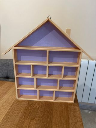 Preciosa casita de madera para colgar, ideal para decorar o exponer pequeños objetos. Está pintada de color amarillo pastel y tiene compartimentos interiores de color lila. medidas alto 39 cm, ancho 40 cm, fondo 3,5 cms - Diseño de casita con tejado. - Madera resistente y bien pintada. buen colgante