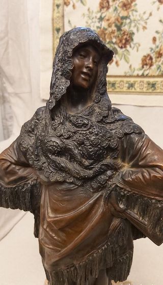 MAJA ESPAÑOLA SEGUN EL DISEÑO DE VENANCI VALLMITJANA (BARCELONA 1830 - 1919). FIRMADA. SELLO DE ARTESANÍA URREGUI. ESCULTURA EN TERRACOTA PATINADA SOBRE PEANA. ALTURA: 44 CM. PEANA INCLUIDA. ANCHO: 21 CM. PESO: 5 KG. - Representa a una mujer ataviada con un mantón y tocado. - Firmada en la base.