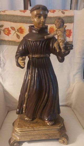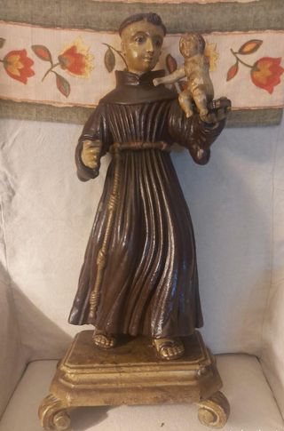 Figura religiosa de San Antonio con el Niño Jesús, de estilo español. - Talla de madera. - Detalle de túnica y cordón franciscano. ESCUELA ESPAÑOLA. SIGLO XIX. 51 CM. LA IMAGEN 60 CM. CON LA PEANA. LAS FOTOS FORMAN PARTE DE LA DESCRIPCIÓN