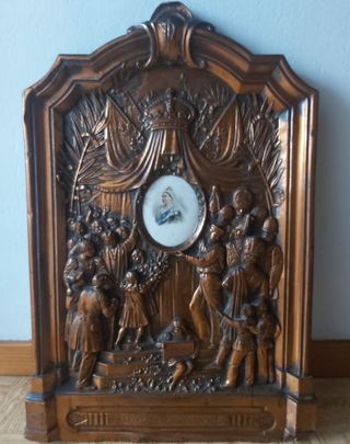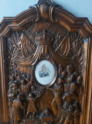 Placa conmemorativa de la monarquía española, con un retrato central de la Reina Victoria. - Representación de figuras históricas y símbolos. - Marco ornamental. Placa conmemorativa de sexagésimo aniversario del Reinado de Victoria de Inglaterra. Siglo XIX Firmada C. Caccia 63x43 cm. Parte trasera con yeso