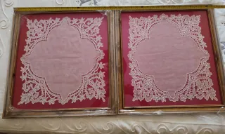 Cuadros decorativo con pañuelo con bordado artesanal Richelieu. - Encaje Richelieu. - Fondo rojo. - Marco de madera. - Totalmente nuevo. Dispongo de dos unidades iguales. El precio es por unidad.