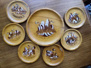 Lote de 7 posavasos de artesanía de madera con ilustraciones de pirograbado pintadas a mano de varias cumbres de Las Dolomitas. - Carezza. - Misurina. - Passo Falzarego. - Passo Sella. - Tre Cime di Lavaredo. - Passo Pordoi. - Passo Rolle.
