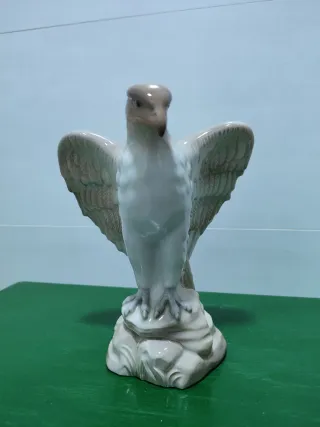 Figura decorativa de un águila realizada en porcelana por la prestigiosa casa valenciana PORCEGAMA. - Detallado diseño de águila con alas extendidas. - Base rocosa que simula su hábitat natural. - Acabado brillante y suave al tacto. 22 cm