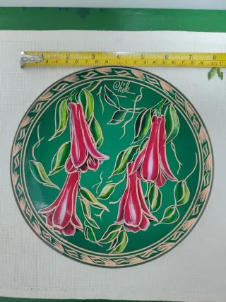 Plato decorativo de cobre con flores de copihue y borde ornamentado. - Motivo central de flores de copihe y hojas verdes. - Inscripción Chile en la parte superior. - Borde con diseño de grecas en tonos beige y verde.