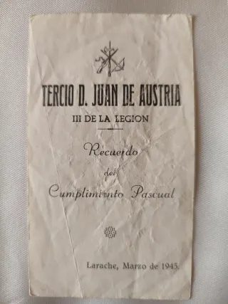 Documento histórico del Tercio D. Juan de Austria. - Recuerdo del Cumplimiento Pascual. - III de la Legión. - Fecha: Larache, Marzo de 1945. Mide 6 x 10 cm
