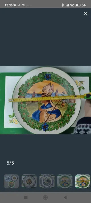 Precioso plato decorativo de cerámica, pintado a mano con un diseño único. - Motivo central con figura histórica y castillo. - Borde decorado con guirnalda de hojas y frutos. - Diámetro 33 cm