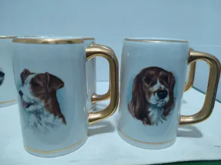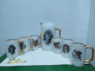 Conjunto de jarra grande y seis jarras de porcelana, cada una decorada con la imagen de un perro diferente. Los bordes y asas de las tazas, así como el asa de la jarra, son dorados. - Jarra de porcelana con diseño de caniche. - Seis jarras de porcelana con diferentes razas de perros. - Detalles dorados en asas y bordes. Años setenta.