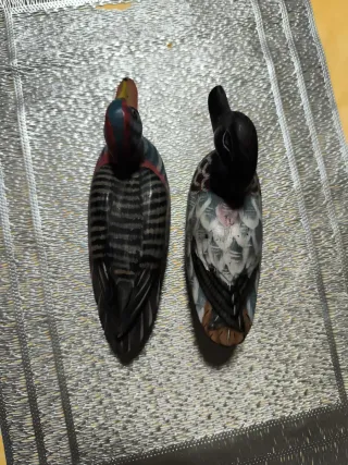 Conjunto de dos patitos de madera, ideales para decoración. - Diseño artesanal. - Pintura detallada en cuerpo y cabeza. - Colores vivos y variados.