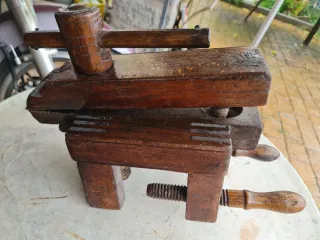 Herramienta de carpintería antigua, fabricada en madera. Ideal para trabajos de ebanistería o como pieza de colección. - Construcción robusta de madera. - Mecanismo de apriete con tornillo.