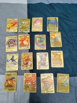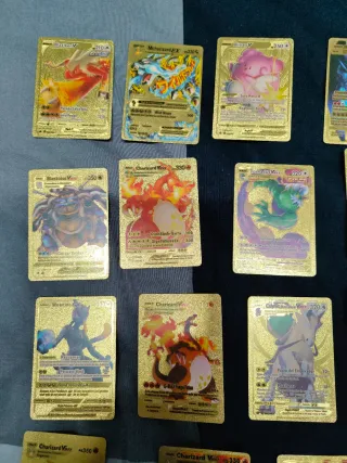 Colección de cartas Pokémon con acabado dorado brillante. Cada carta presenta un diseño único y detallado. Son cartas decorativas - En buen estado - Cartas con arte especial. - Acabado metálico dorado. - Diseños variados de Pokémon.
