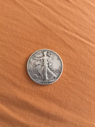 Moneda de medio dólar de plata con la figura de la Libertad. - Diseño de la Libertad caminando. - Año de acuñación: 1942. - Inscripción IN GOD WE TRUST.